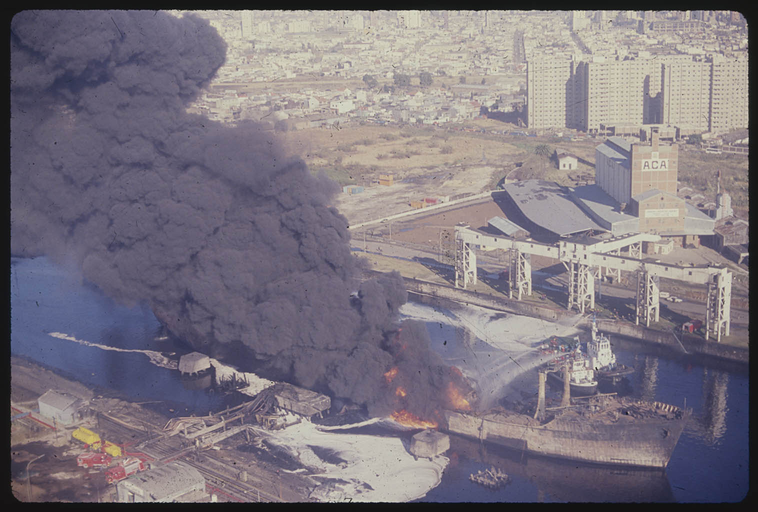 Registro del incendio del buque tanque “Perito Moreno” propiedad de la flota costera de YPF, iniciado la noche del 28 de junio mientras descargaba crudo, lo que generó una explosión que puso en peligro al Polo Petroquímico y a la comunidad de Villa Inflamable. Dock Sud, Buenos Aires, Argentina.