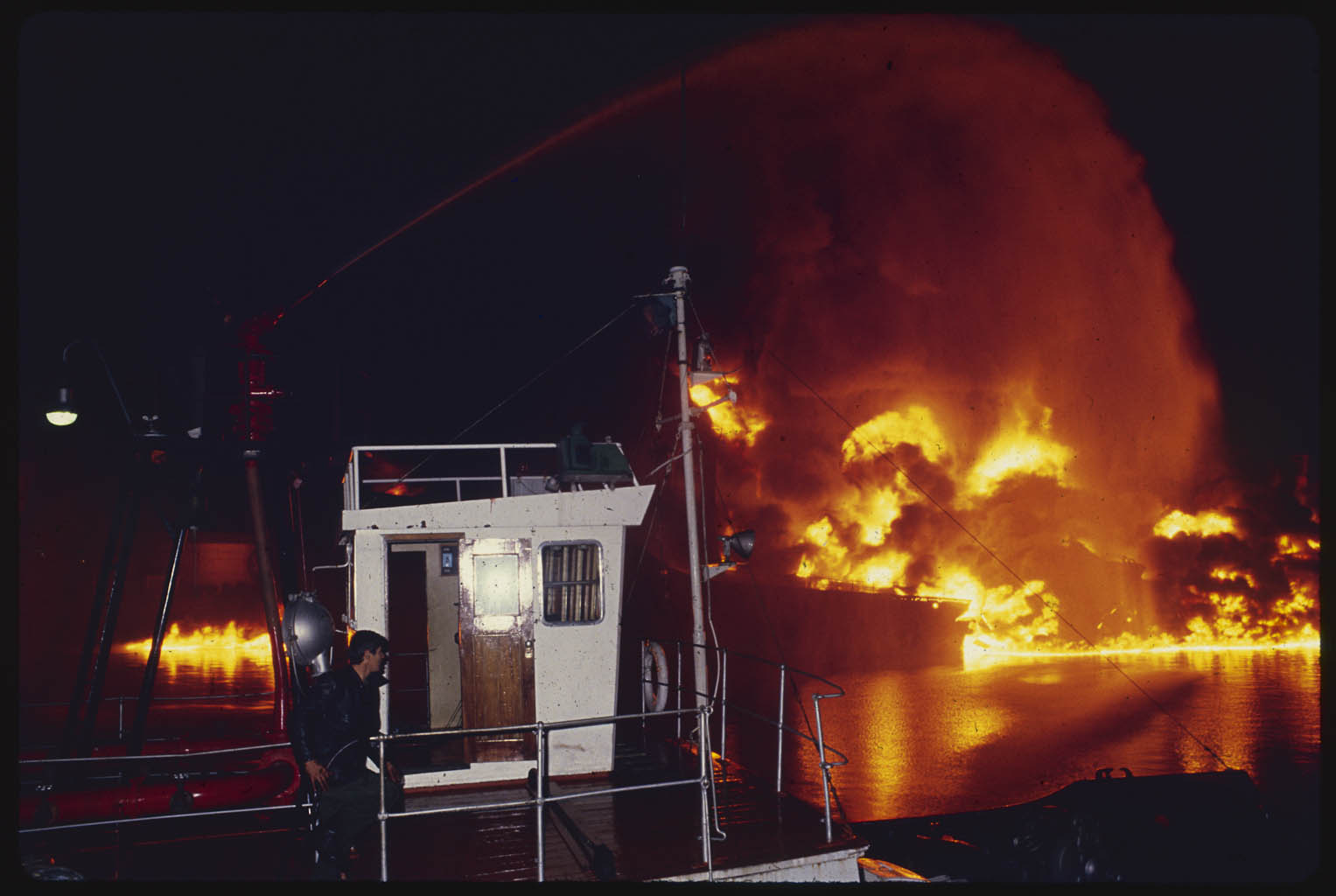 Registro del incendio del buque tanque “Perito Moreno” propiedad de la flota costera de YPF, iniciado la noche del 28 de junio mientras descargaba crudo, lo que generó una explosión que puso en peligro al Polo Petroquímico y a la comunidad de Villa Inflamable. Dock Sud, Buenos Aires, Argentina.