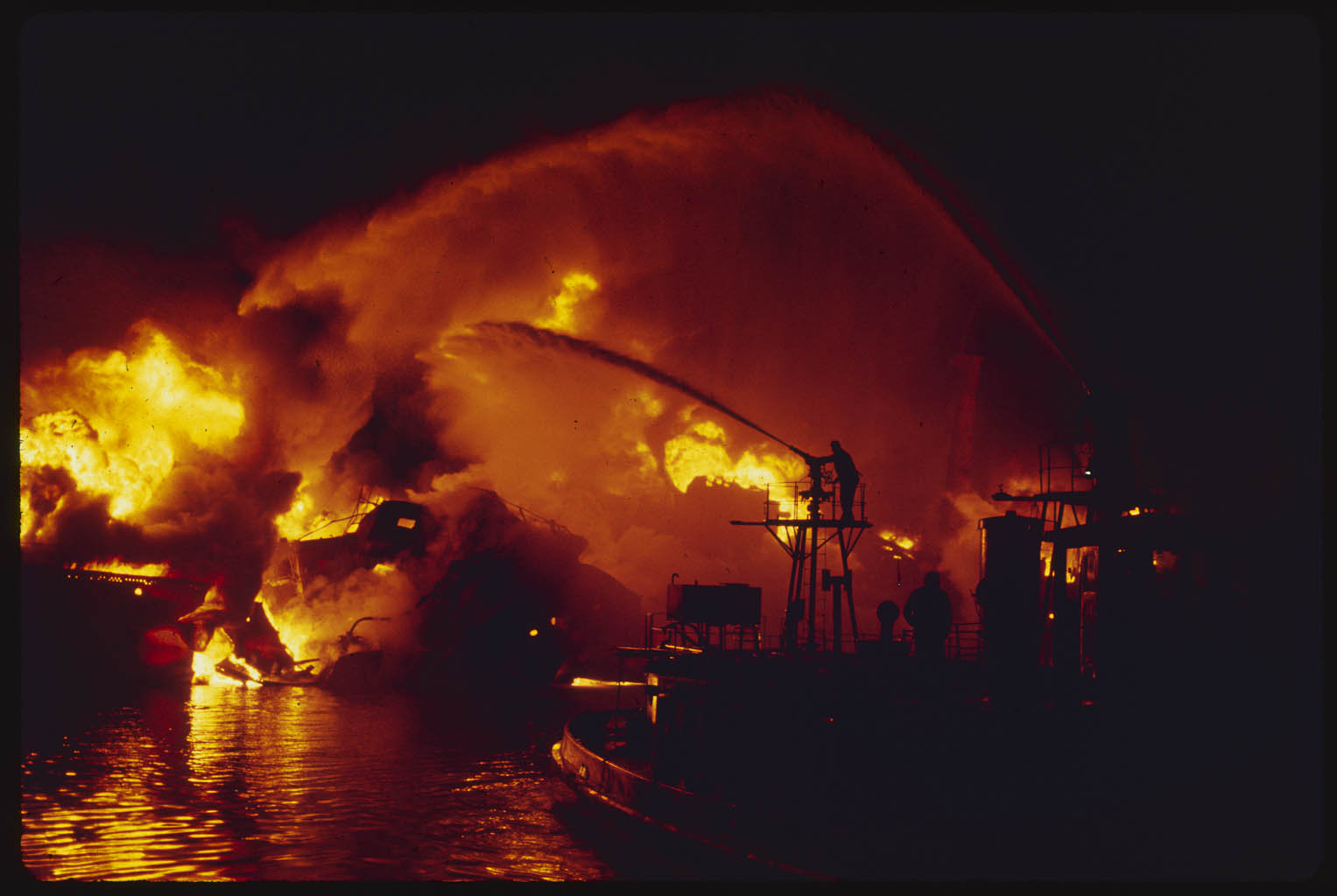 Registro del incendio del buque tanque “Perito Moreno” propiedad de la flota costera de YPF, iniciado la noche del 28 de junio mientras descargaba crudo, lo que generó una explosión que puso en peligro al Polo Petroquímico y a la comunidad de Villa Inflamable. Dock Sud, Buenos Aires, Argentina.