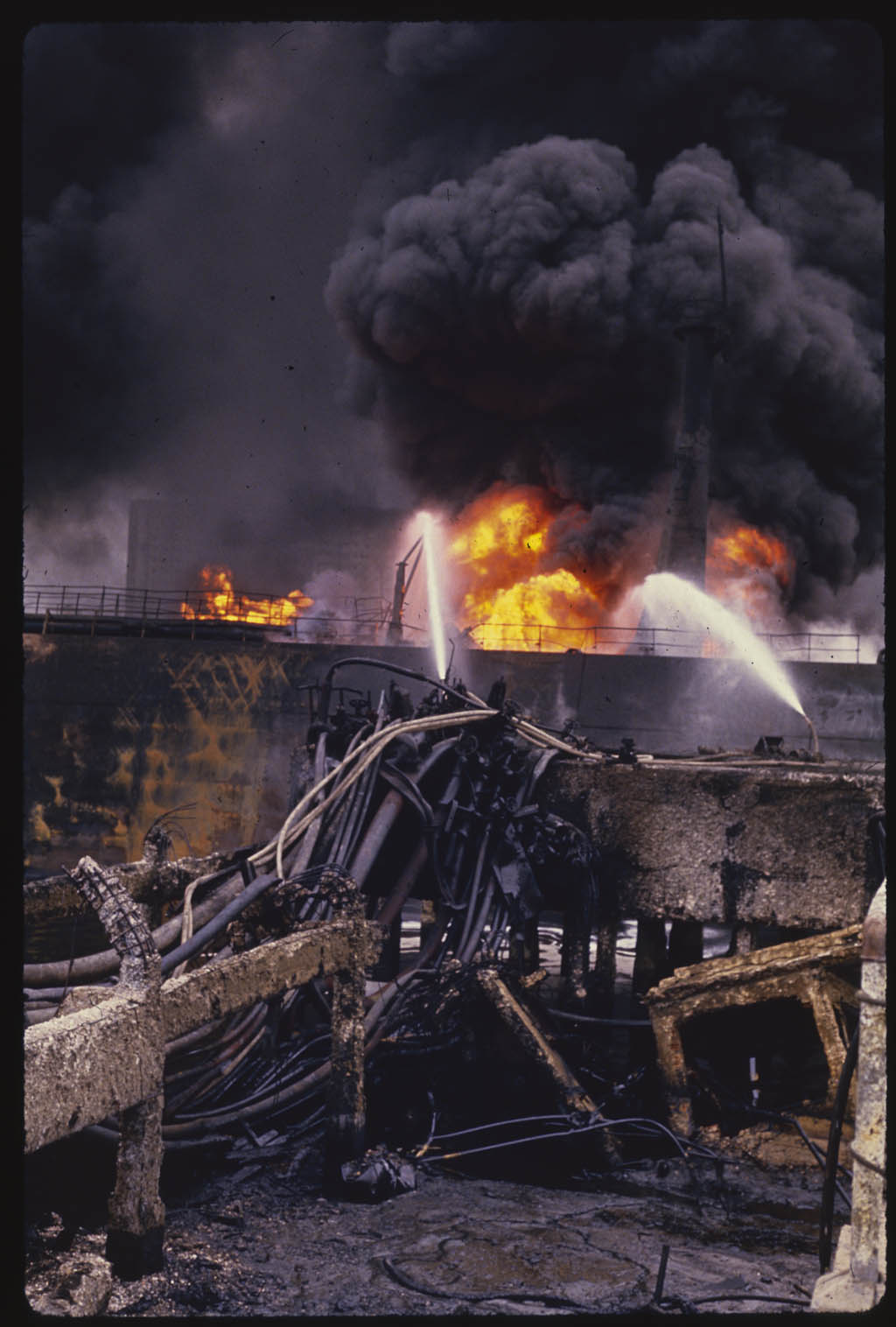 Registro del incendio del buque tanque “Perito Moreno” propiedad de la flota costera de YPF, iniciado la noche del 28 de junio mientras descargaba crudo, lo que generó una explosión que puso en peligro al Polo Petroquímico y a la comunidad de Villa Inflamable. Dock Sud, Buenos Aires, Argentina.