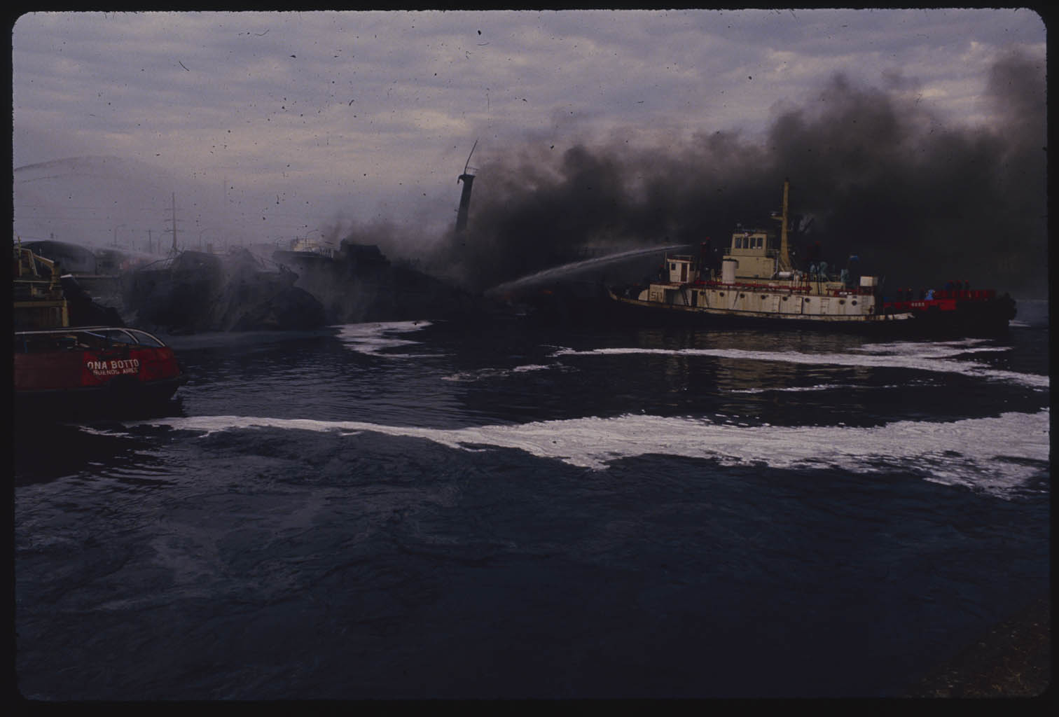 Registro del incendio del buque tanque “Perito Moreno” propiedad de la flota costera de YPF, iniciado la noche del 28 de junio mientras descargaba crudo, lo que generó una explosión que puso en peligro al Polo Petroquímico y a la comunidad de Villa Inflamable. Dock Sud, Buenos Aires, Argentina.