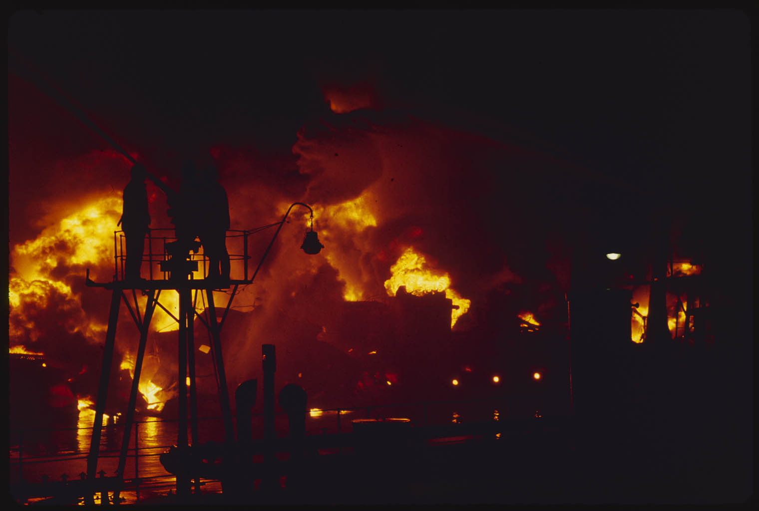 Registro del incendio del buque tanque “Perito Moreno” propiedad de la flota costera de YPF, iniciado la noche del 28 de junio mientras descargaba crudo, lo que generó una explosión que puso en peligro al Polo Petroquímico y a la comunidad de Villa Inflamable. Dock Sud, Buenos Aires, Argentina.