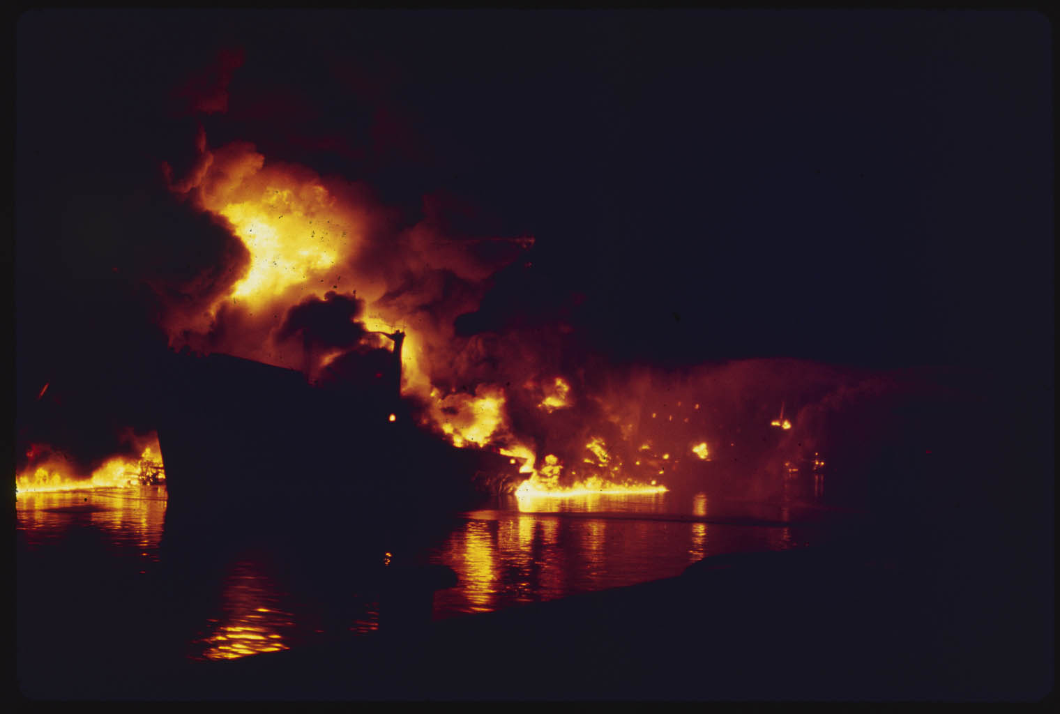 Registro del incendio del buque tanque “Perito Moreno” propiedad de la flota costera de YPF, iniciado la noche del 28 de junio mientras descargaba crudo, lo que generó una explosión que puso en peligro al Polo Petroquímico y a la comunidad de Villa Inflamable. Dock Sud, Buenos Aires, Argentina.