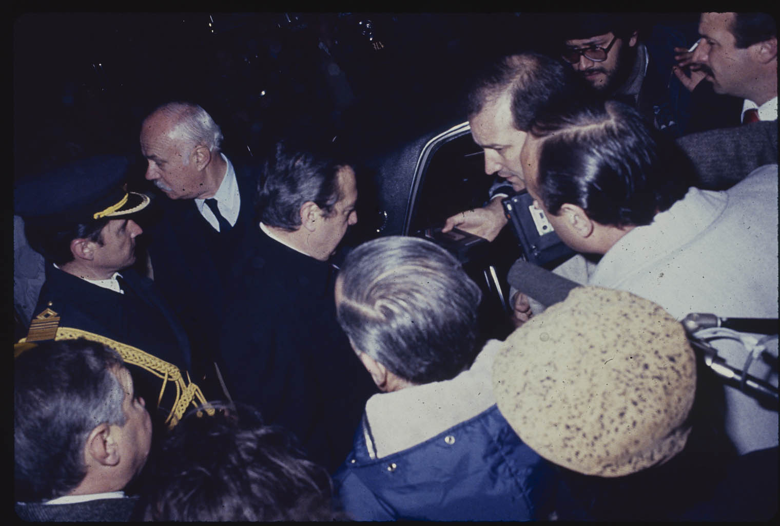 El Presidente Raúl Alfonsín llega a Dock Sud durante el operativo para apagar el incendio del buque tanque “Perito Moreno” propiedad de la flota costera de YPF. Dock Sud, Buenos Aires, Argentina.