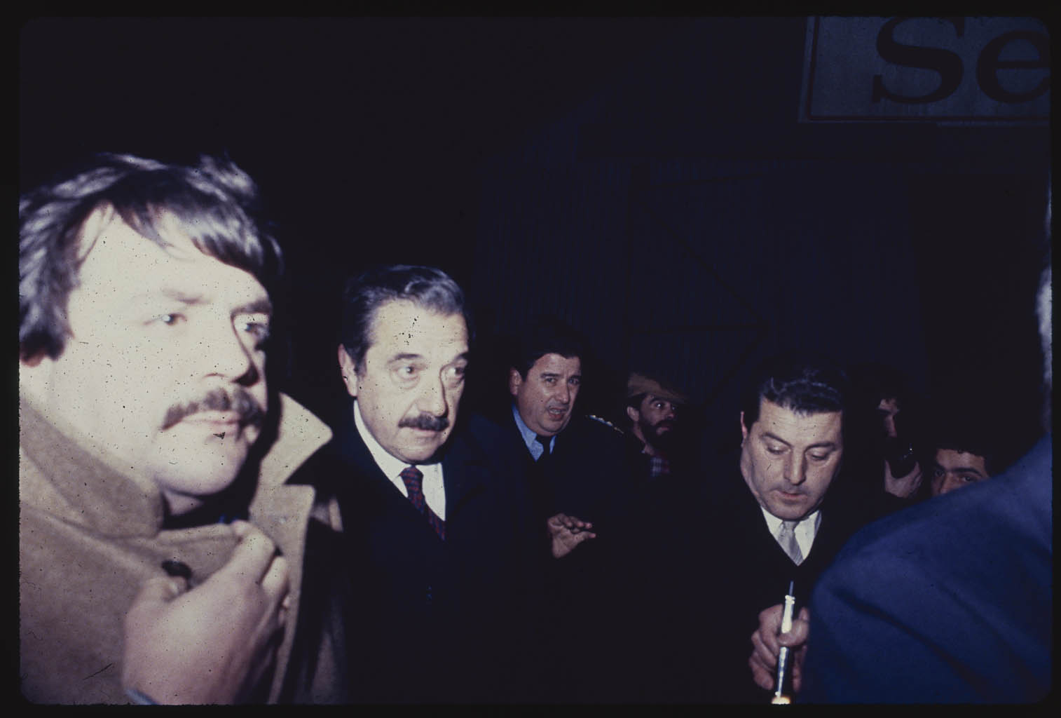 El Presidente Raúl Alfonsín llega a Dock Sud durante el operativo para apagar el incendio del buque tanque “Perito Moreno” propiedad de la flota costera de YPF. Dock Sud, Buenos Aires, Argentina.