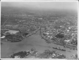 Vista aérea de la cuenca del Riachuelo y la zona portuaria e industrial aledaña. Dock Sud, Buenos Aires, Argentina.