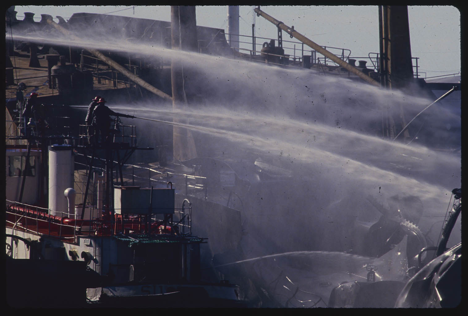Registro del incendio del buque tanque “Perito Moreno” propiedad de la flota costera de YPF, iniciado la noche del 28 de junio mientras descargaba crudo, lo que generó una explosión que puso en peligro al Polo Petroquímico y a la comunidad de Villa Inflamable. Dock Sud, Buenos Aires, Argentina.