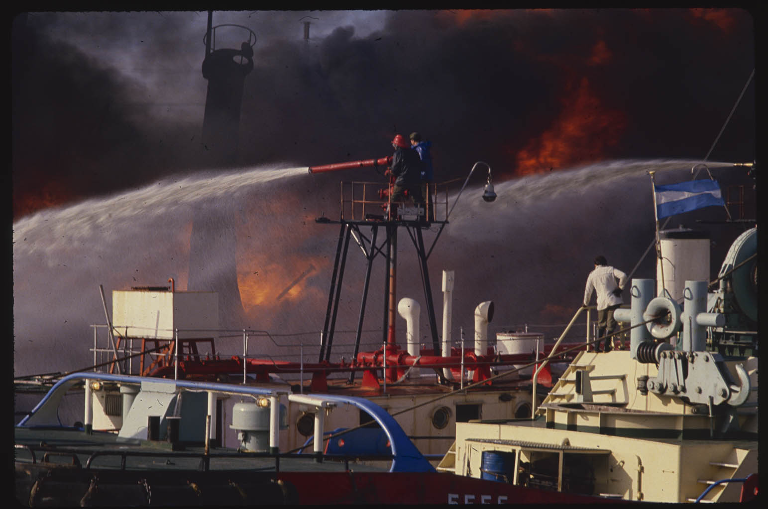 Registro del incendio del buque tanque “Perito Moreno” propiedad de la flota costera de YPF, iniciado la noche del 28 de junio mientras descargaba crudo, lo que generó una explosión que puso en peligro al Polo Petroquímico y a la comunidad de Villa Inflamable. Dock Sud, Buenos Aires, Argentina.