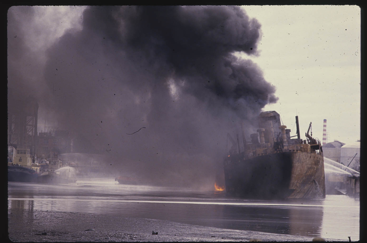 Registro del incendio del buque tanque “Perito Moreno” propiedad de la flota costera de YPF, iniciado la noche del 28 de junio mientras descargaba crudo, lo que generó una explosión que puso en peligro al Polo Petroquímico y a la comunidad de Villa Inflamable. Dock Sud, Buenos Aires, Argentina.