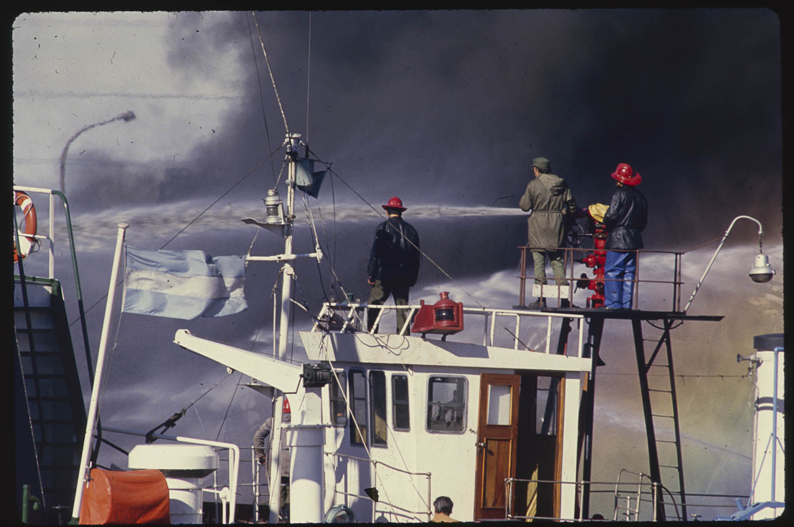 Registro del incendio del buque tanque “Perito Moreno” propiedad de la flota costera de YPF, iniciado la noche del 28 de junio mientras descargaba crudo, lo que generó una explosión que puso en peligro al Polo Petroquímico y a la comunidad de Villa Inflamable. Dock Sud, Buenos Aires, Argentina.