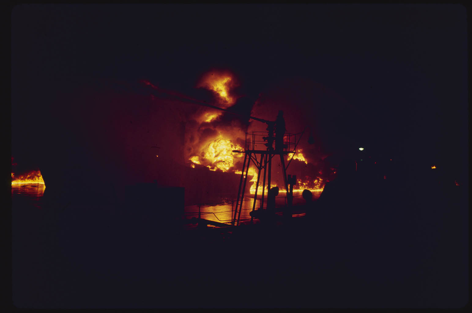 Registro del incendio del buque tanque “Perito Moreno” propiedad de la flota costera de YPF, iniciado la noche del 28 de junio mientras descargaba crudo, lo que generó una explosión que puso en peligro al Polo Petroquímico y a la comunidad de Villa Inflamable. Dock Sud, Buenos Aires, Argentina.